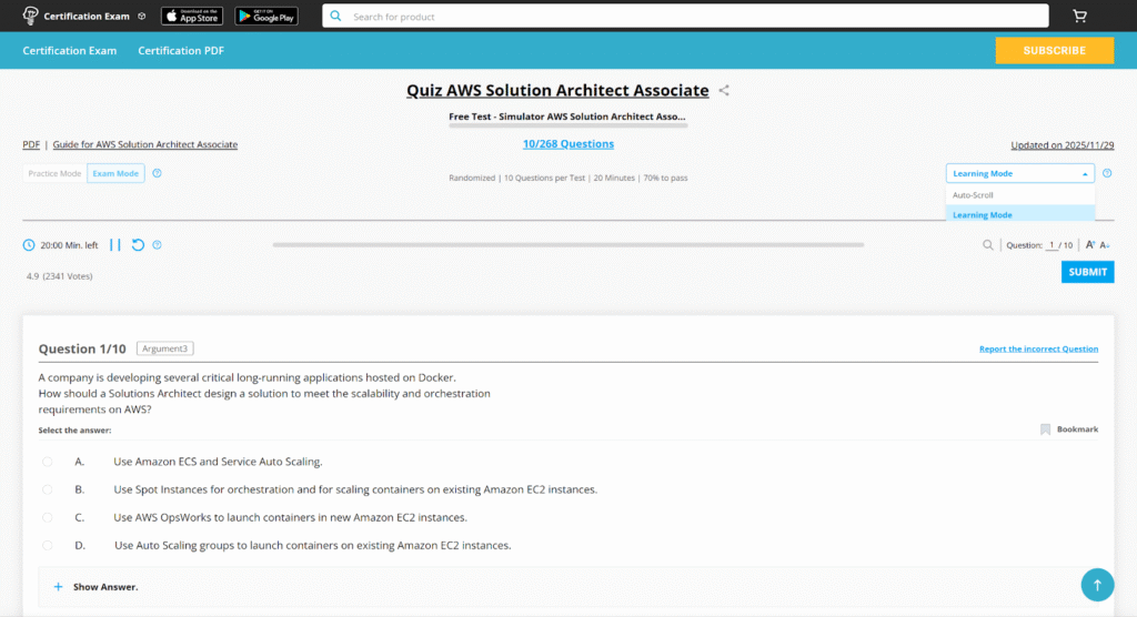 With the right tools, getting your AWS Solutions Architect Associate (SAA) Certification is possible. Certification-Exam offers an excellent tool to help you with the preparation process. Its focus is on the AWS SAA, and Certification-Exam offers realistic AWS SAA practice test questions in both Practice Mode and Exam Mode, clear answer explanations, and in-depth customization for your individual needs, so you can study the areas where you have weaknesses. Also, because of the mobile app, you can use the offline study feature, auto-scroll feature, and automatic learning components to create an on-the-go study experience for yourself. Additionally, the use of AI technology within Certification-Exam will make sense of your strengths and weaknesses as you navigate through your study plan.